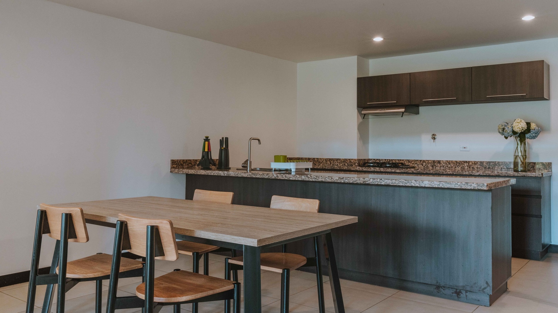 Modern one-room apartment with king-size bed or two single beds, bathroom, living room with single sofa bed and balcony, fully equipped open American-style kitchen