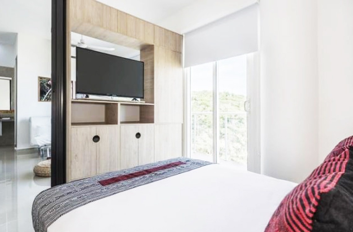 Master bedroom with double bed, bathroom, second bedroom with two single beds, bathroom, a double sofa bed in the living room, equipped kitchen, living room and balcony.