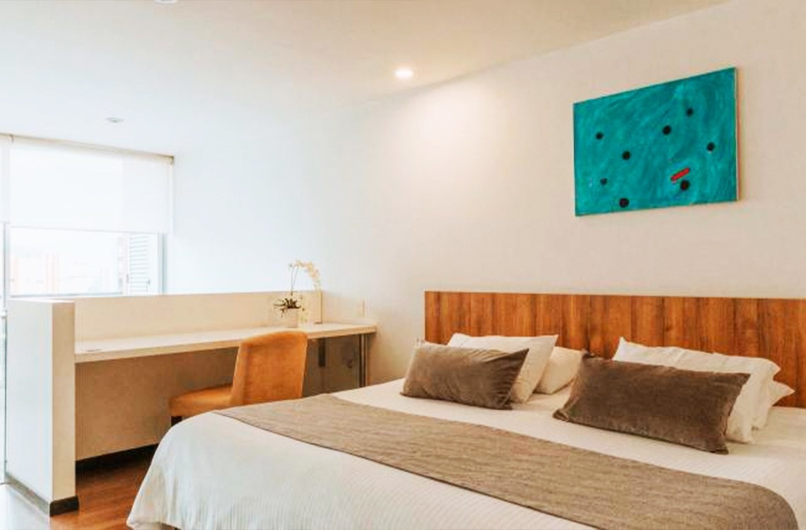 Apartamento duplex , primer piso: sala comedor con sofa cama, baño completo, cocina abierta tipo americano totalmente equipada y balcon exterior. En el segundo piso tiene: Cama King o dos camas sencillas, escritorio, baño vestier 1 o 3 personas